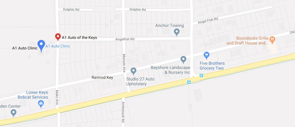 OUR LOCATION We are located on Ramrod Key, at 115 Mako Avenue. The turnoff for Mako Avenue is at Mile Marker 26.5 off of Route 1 just south of Boondocks Grill. From the street, you will see this: A Map of our location is at the A1 Auto Clinic (our former name) location on Google Maps: | |||||